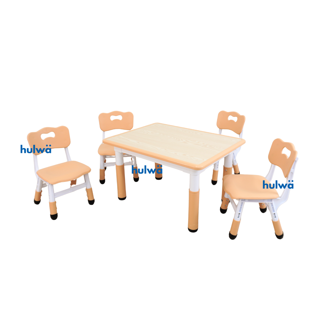 Satu set berisi 1 Meja ukuran 60 x 80 cm ditambah dengan 4 kursi. Meja bisa digunakan sebagai media tulis yang mudah di bersihkan.